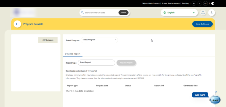 Program Dashboards are accessible to anyone who has Program Manager and Program Designer rights on DIKSHA platform. To access program’s report, the Program Manager and Designer need to be mapped to that Program. For Eg: Program Manager A has access to the Program data, only they are mapped as a Program Manager for Program. These reports are generated on-demand based on user requests. The requested report is generated within 24 hours.