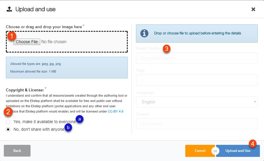 Note: Supported file formats are: .jpeg, .jpg, .png 2. Under Copyright and License, select if you want to: a) Make it available to everyone b) Not share with anyone 3. Add image details in the Asset Caption area. Details such as, Tags, Details, Creator are optional 4. Click Upload and Use to upload the image | ![]() |