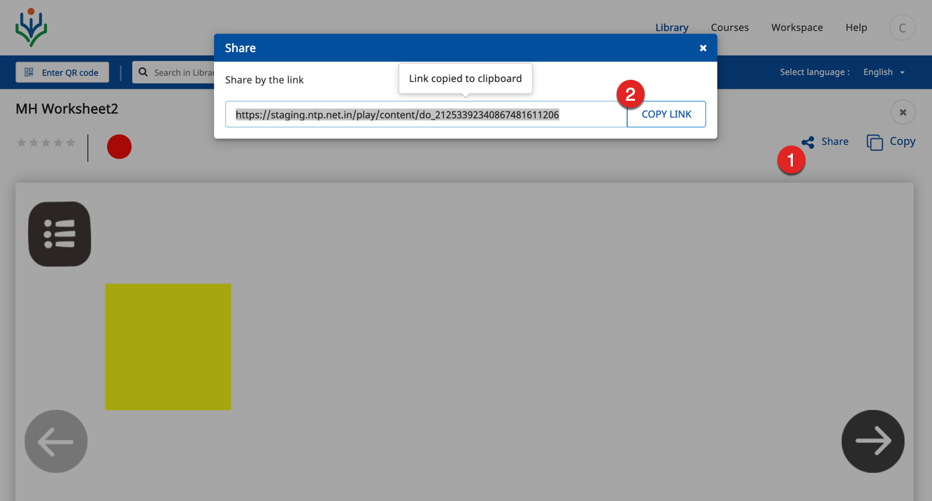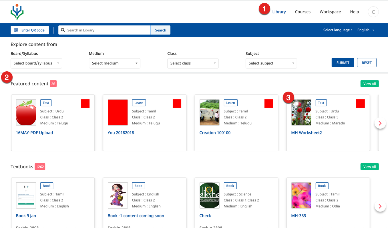 Book creators can add links of resources published on DIKSHA in the .csv file in the column titled, Linked Content. For any given topic, upto three resources can be added. To add a resource URL: 1. Click Library tab 2. Browse and select the resource you want to link 3. Click the content card | ![]() |