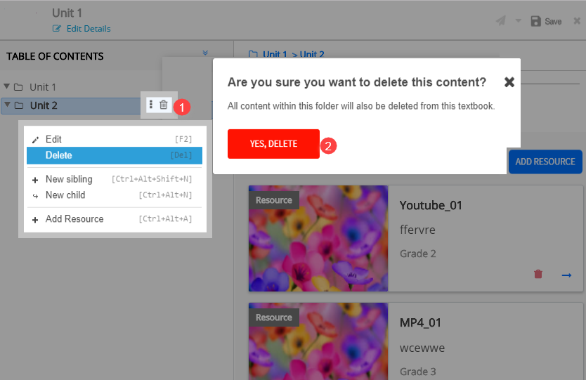 1. Click Delete icon beside the burger menu 2. Click Yes to delete the added content Note: You can alternatively delete content by clicking Delete in the burger menu drop-down | ![]() |