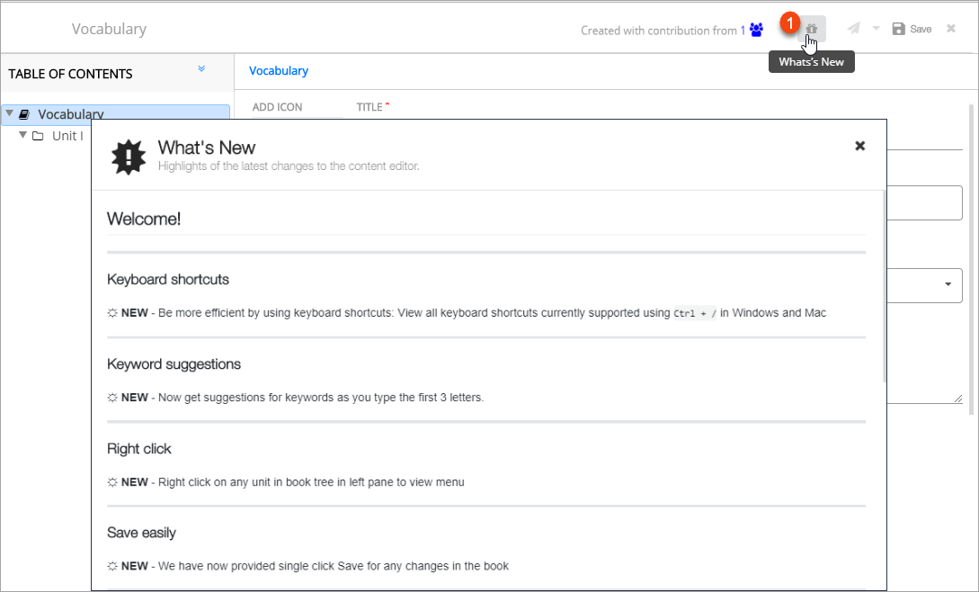 1. Click on the What's New icon to view concise information about new product functionality Note: The What's New icon is red before you view it for the first time. The icon turns grey after you view the information, until the next product version | ![]() |