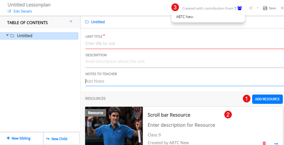 2. The resource is added to the Lesson Plan 3. The names of the resource owners appears under Created with Contributions From button | ![]() |
