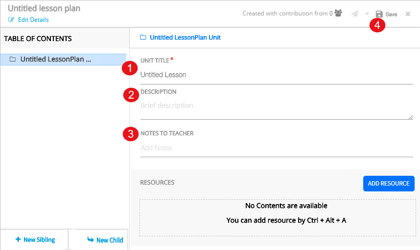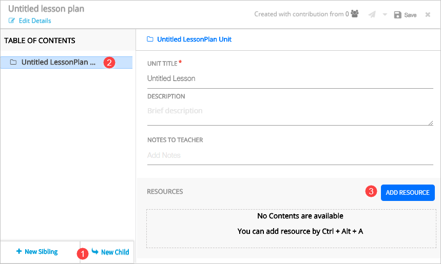 2. On clicking child node, a heading is added to the Table of Contents pane. For details on child node, sibling node, refer Exploring ToC Structure 3. Click Add Resource to add content to the headings. For details on adding resources, refer Adding Resources | ![]() |