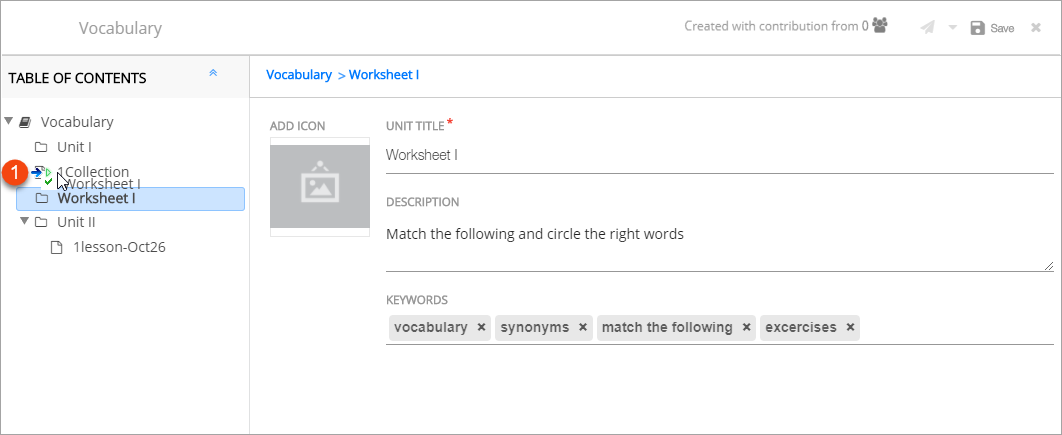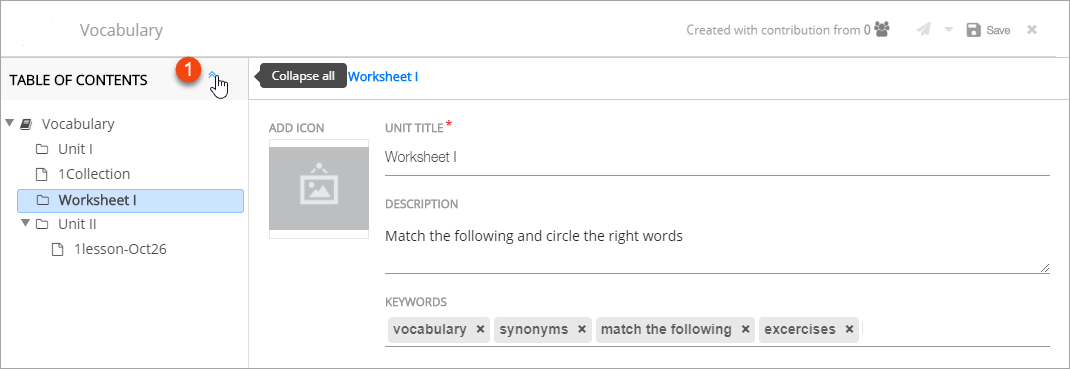 You can see Table of Content tree in the left pane to navigate content compiled for a collection, textbook, course or lesson plan. You can manipulate the tree using either: