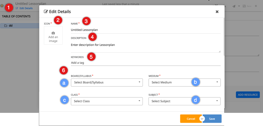 2. Click the camera icon to add an image Note: For details, refer Adding Image to Metadata 3. Enter Name 4. Enter Description for the lesson plan 5. Enter Keywords 6. Select the values from the following drop-down lists: a) Board/Syllabus b) Medium c) Class d) Subject | ![]() |