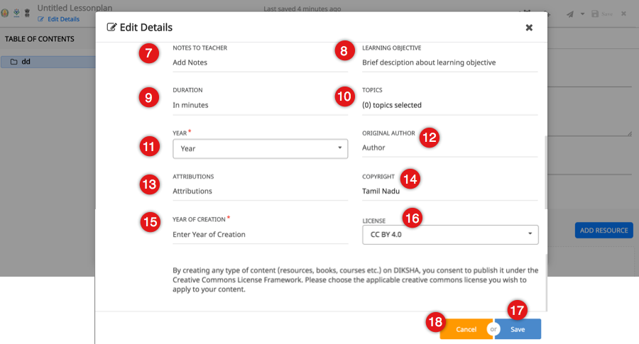 8. Enter Learning Objective 9. Enter Duration 10. Select Topics Note: To know more refer Selecting Topics 11. Select Year 12. Enter Original Author 13. Enter Attributions 14. Enter Copyright 15. Enter Year of Creation 16. Select the License for your content 17. Click Save to collectively save all updates 18. Click Cancel to exit the page | ![]() |