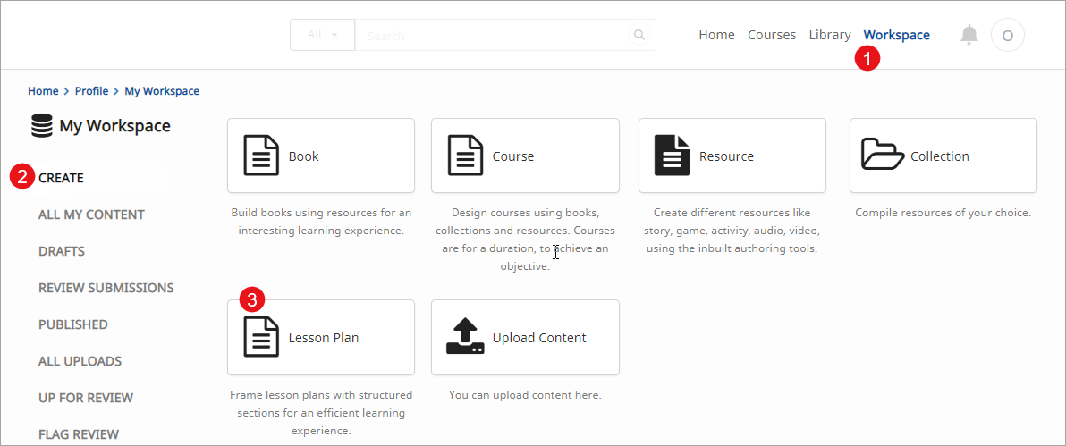 1. You are currently on Workspace 2. You have selected Create 3. You have clicked the Lesson Plan tile | ![]() |