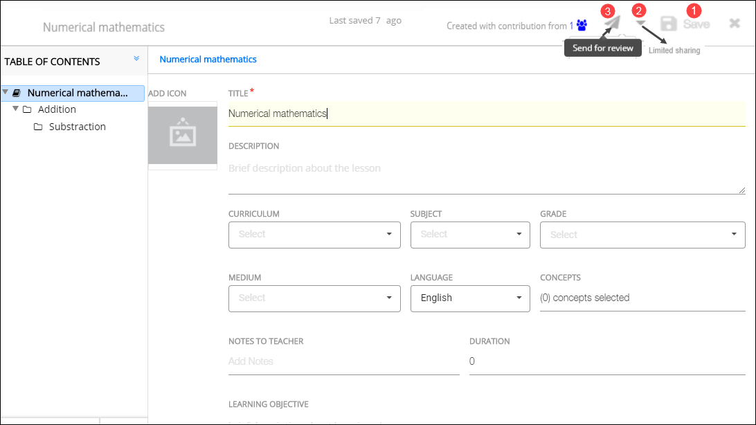 1. Click Save on the header to save the lesson 2. Click Limited sharing to publish the lesson to the limited audiences Note: Refer Limited Publishing and Sharing to view and share all the contents created and ready for sharing. 3. Click Send for review to send the created lesson for review | ![]() |