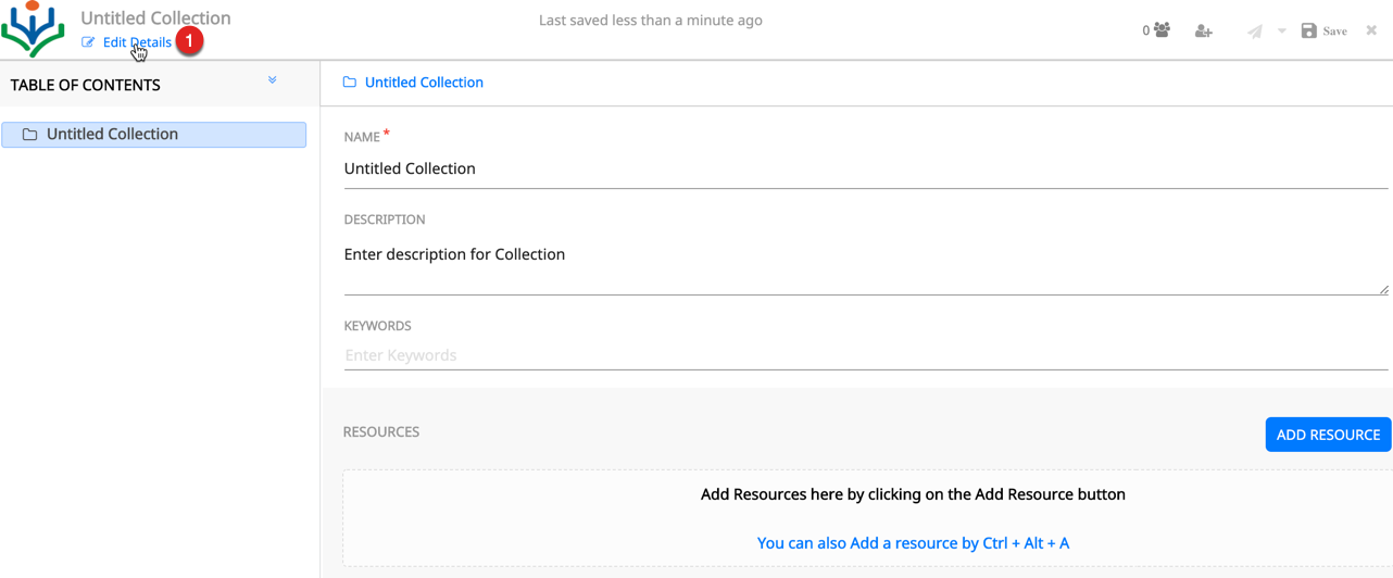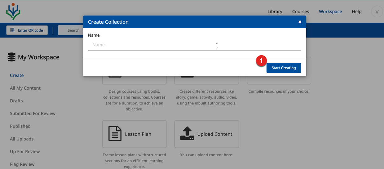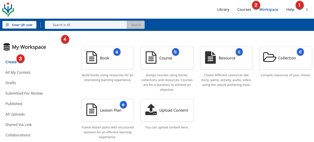 2. You are currently on My Workspace 3. SelectCreate 4. You have clicked any one of the following content tiles: a. Book b. Course c. Resource d. Collection e. Lesson Plan | ![]() |