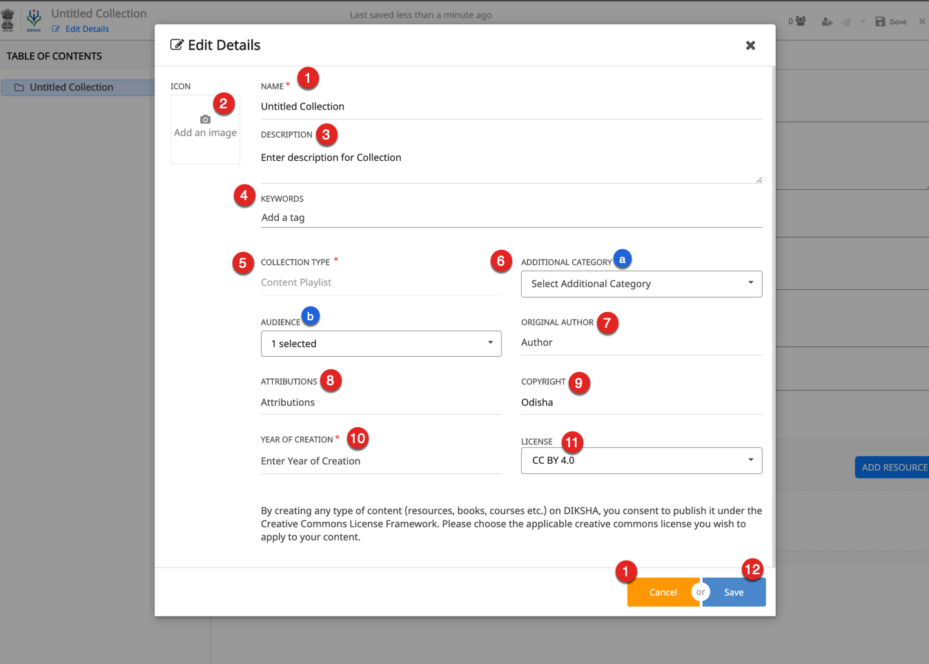 Once you click the Send for review icon, the Edit details window is displayed 1. Enter a Title for the uploaded content 1. Click the Image icon to upload an image for the content. For details on adding image, refer Adding Image to Metadata 2. Enter a Description for the content 3. Enter Keywords to enhance the searchability of the content Note: Keywords help search engines to find content associated with it during a search 4. The Collection Type is auto-filled based on the content type that is being created 5. Select the following from their respective drop-down lists: a. Additional Category b. Audience 6. Enter Audience 7. Enter Original Author 8. Enter Attributions 9. Enter Copyright 10. Enter the Year of Creation 11. Select the License for the content from the drop-down list 12. Click Save 13. Click Cancel to exit the page | ![]() |