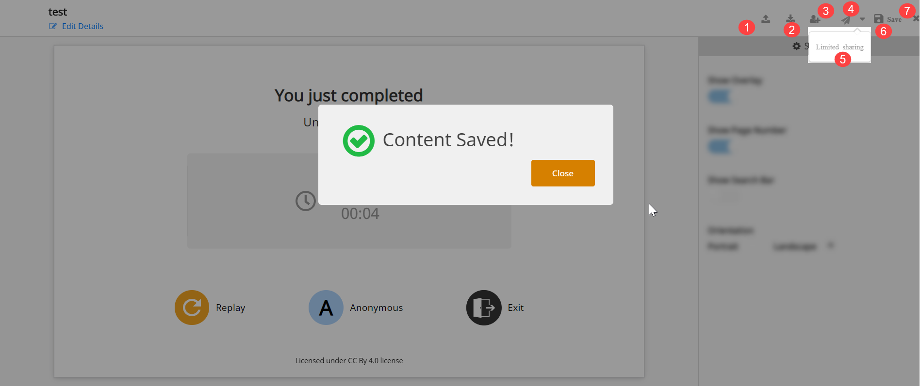 1. Click Upload icon to upload some other additional content to the same editor if required 2. Click Download icon to download the content 3. Click Add Collaborator to add collaborator for the content curation 4. Click the Send Review icon to send the content for review 5. Click the Limited Sharing icon to share the content with a limited audience before publishing the content If you click the drop-down icon beside the Send for Review icon, the Limited Sharing option is displayed 6. Click Save to save the uploaded content 7. Click Exit to exit from the screen | ![]() |
