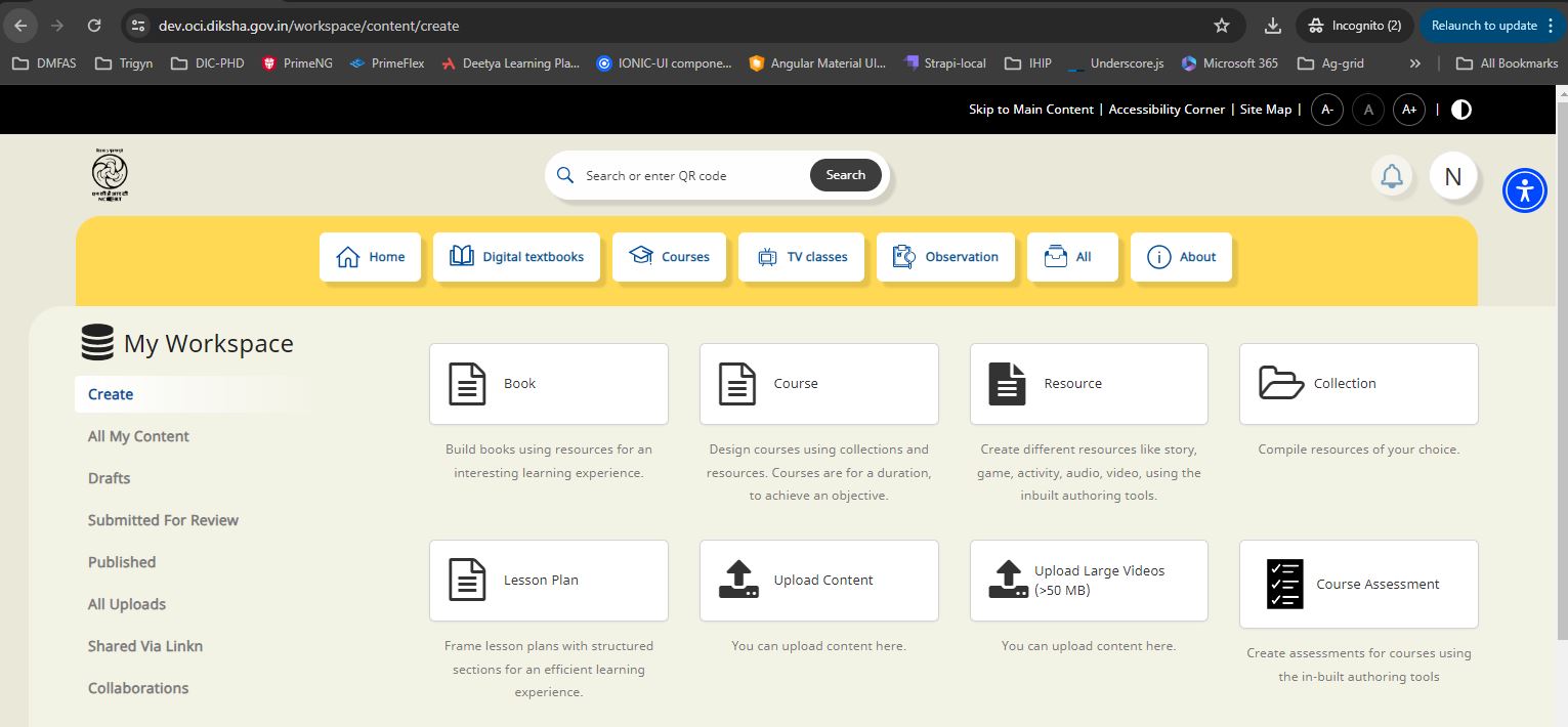 1. Log in to DIKSHA portal using your content creator credential 2. Click Create 3. Click Upload Content | ![]() |