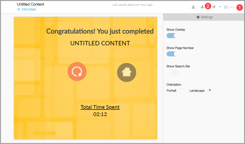 After you finish playing the content, a message You just completed is displayed 2. Click Replay to replay the content 3. Click Exit to exit from the preview screen 4. Click Save to save the uploaded content | ![]() |