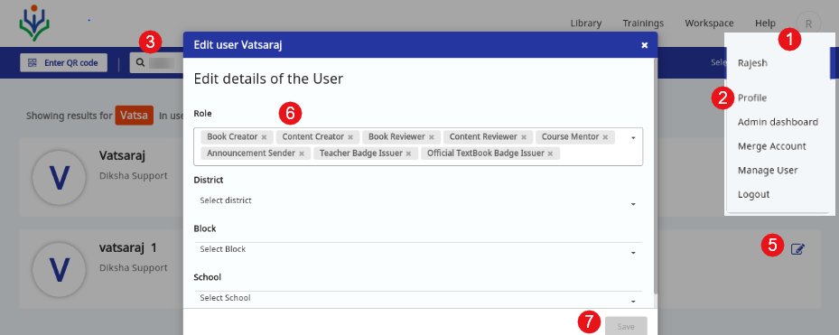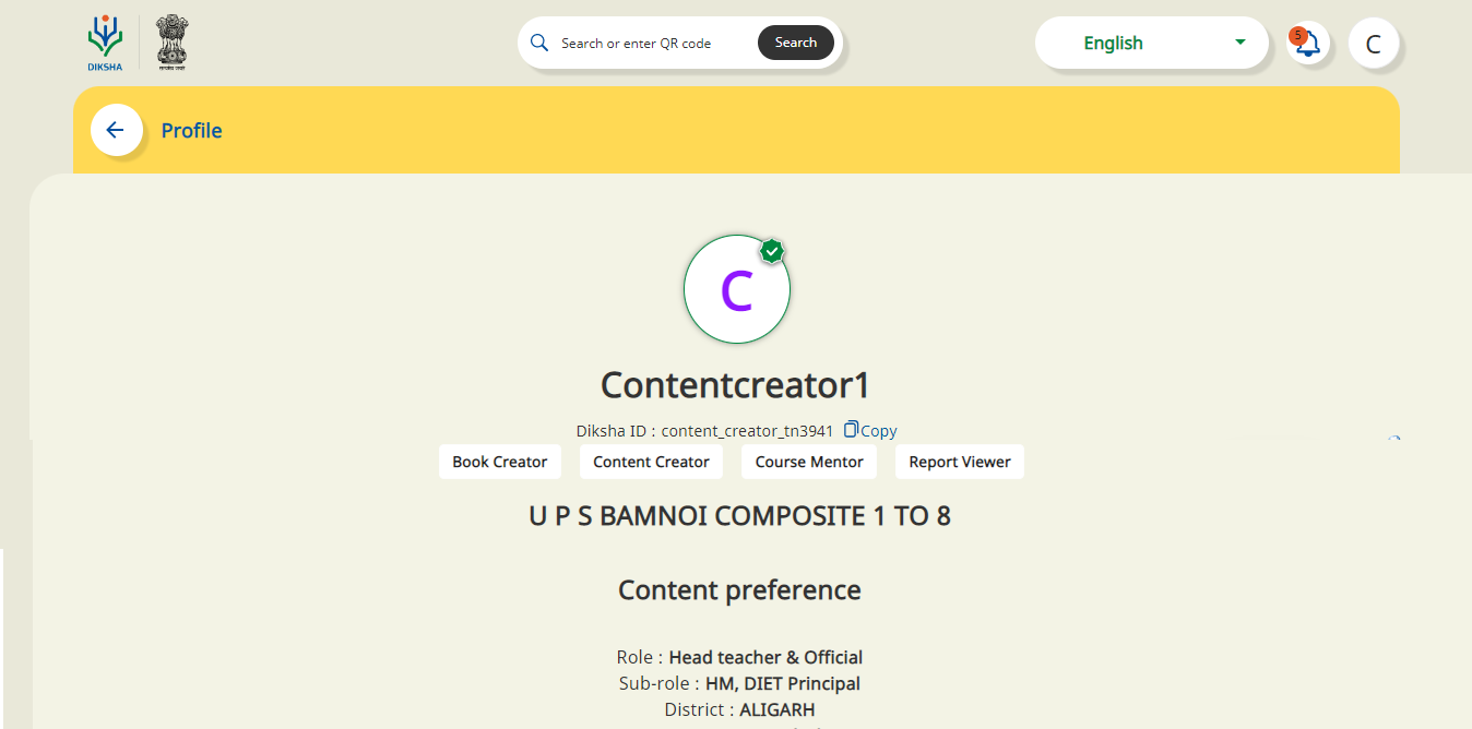 Login to DIKSHA website, go to Profile page. The Profile page displays the various roles assigned to the user. For details about the rights and permission of various roles refer the User Type.