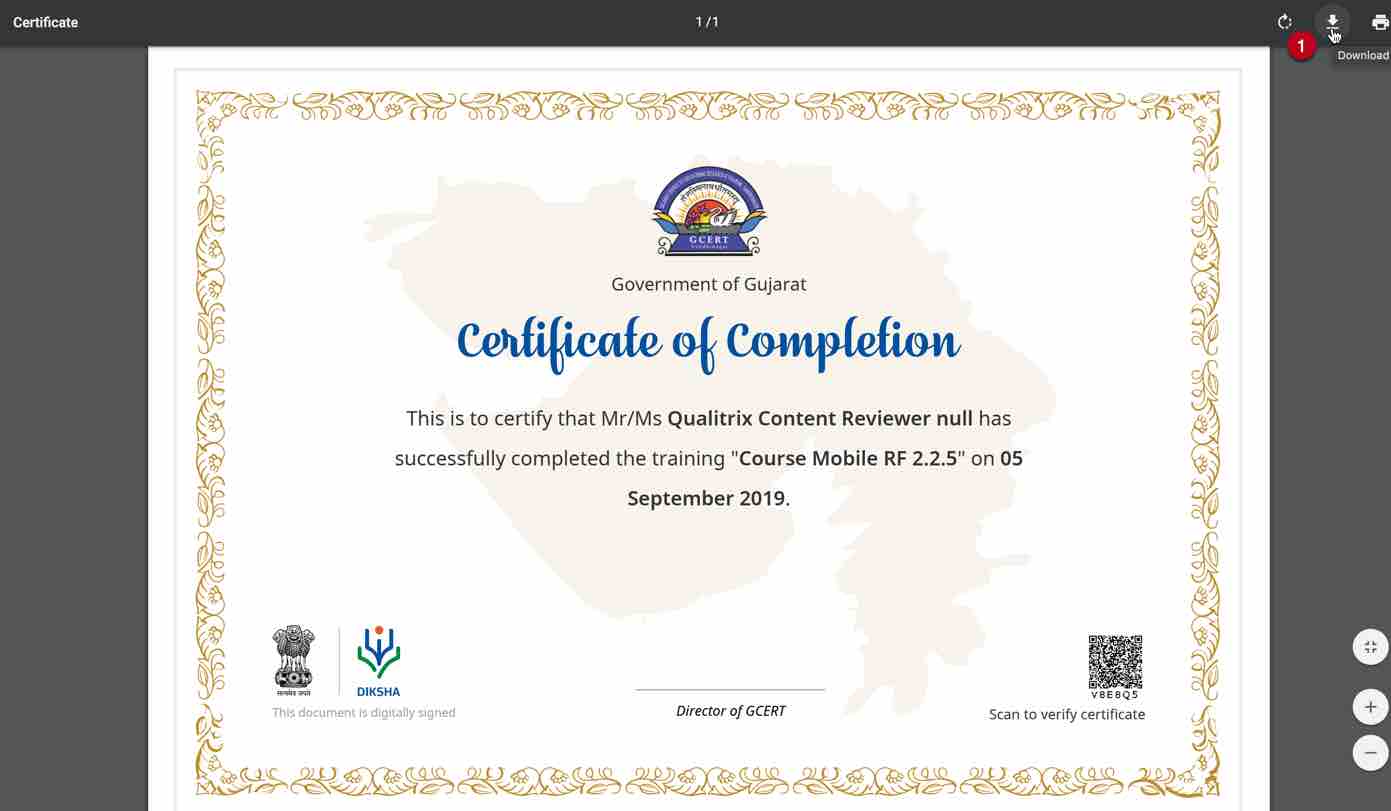 DIKSHA offers certificates after you complete a recommended course. The course details card specifies if the course offers a certificate. Certificate are issued on completion of the course with the criteria of merit and best score of the user. An email or SMS is sent to the user when the certificate issued. The users can view them on the profile page.