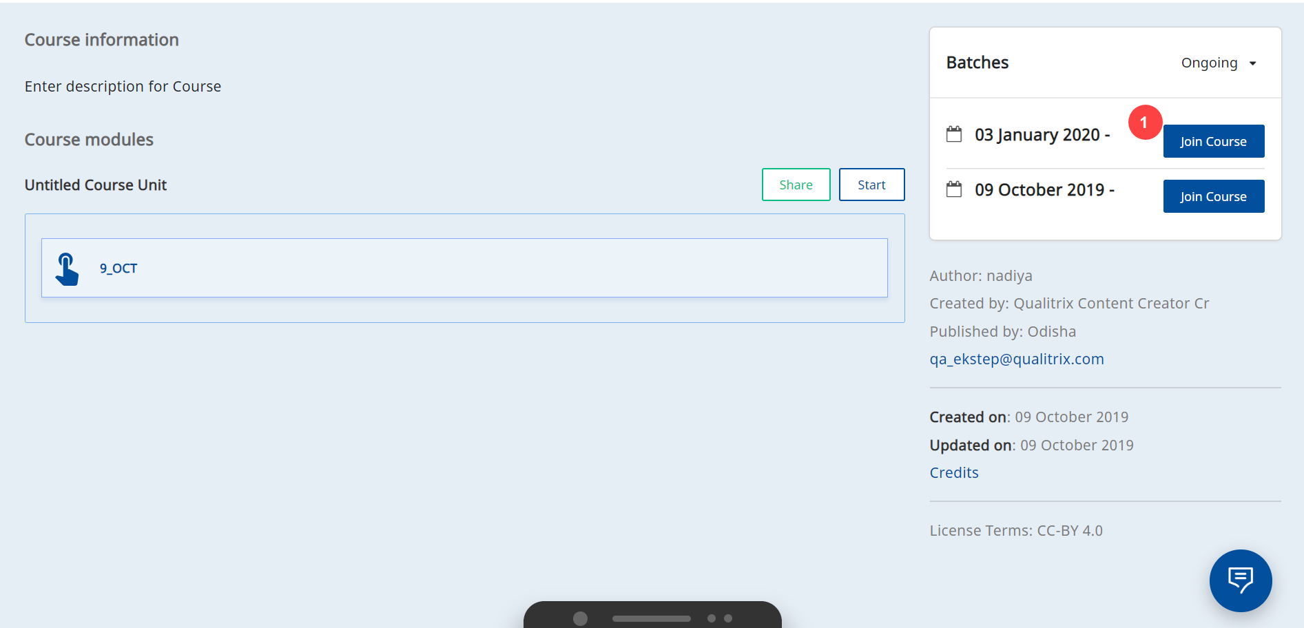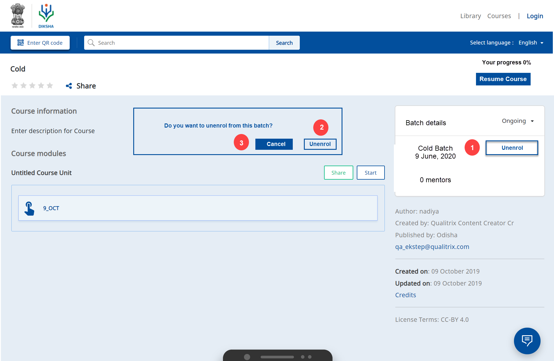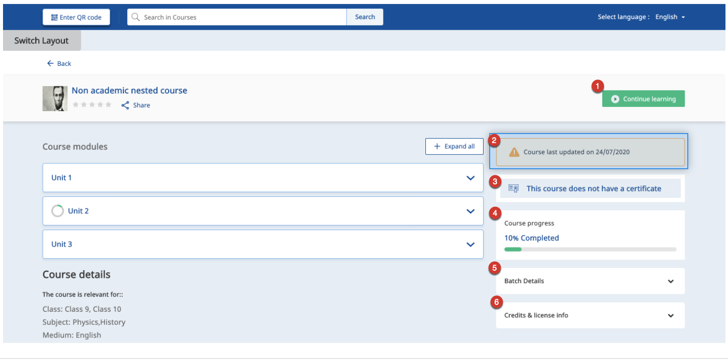 1. Click Continue Learning to revisit the section of the course you last visited. To know more, refer Resuming a course 2. Details of when the course was last updated is displayed here 3. This section indicates if there is a certificate associated with the course 4. View the upcoming and ongoing batch details in Batch details section 5. The progress of the user is captured and displayed here Note: When the course ends the course progress bar is greyed out in the Courses Card and Course TOC page. To know more, refer Accessing a Course after Batch Expiry 6. Click Credits & license info to view all attribution details | ![]() |