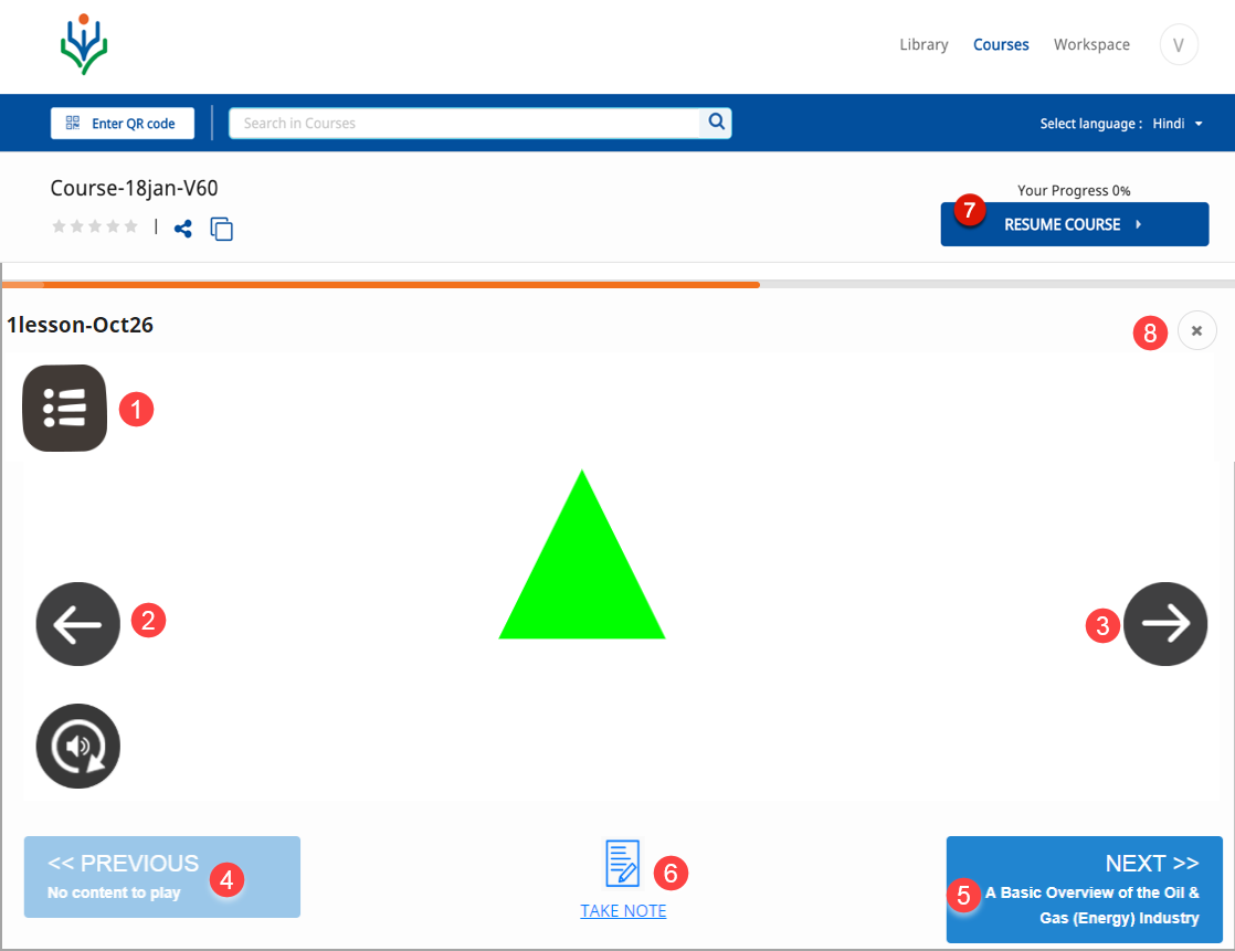 2. Click left scroll icon to go to previous page or slide of course content 3. Click right scroll icon to go to the next page or slide of course content 4. Click Previous, to view study material preceding the current material in the course content list 5. Click Next to view study material immediately subsequent to current material from the course material list 6. Click Take Note to make any notes on the current course material 7. Click Resume course to continue from where you had stopped earlier 8. Click X icon to exit the course. In case you click on the close icon before the course is completed, you can still resume the course. For details refer Resuming a course | ![]() |