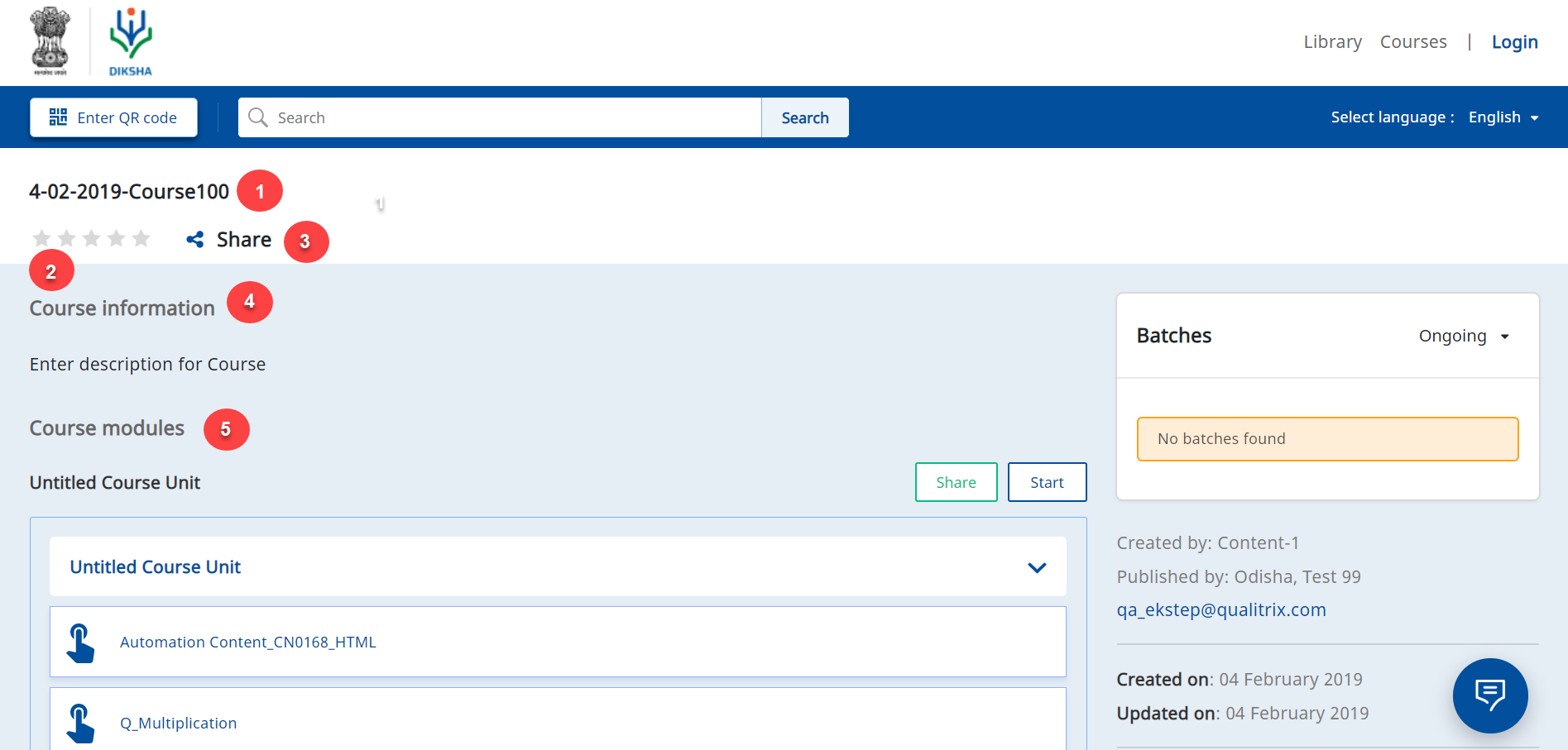 1. Name of the course 2. Rating assigned to the course 3. Click the Share icon to share the course link. Alternatively, you can also share each module within the course individually 4. Description about the course 5. Click Folder icon or (v) icon, to view the content of the course under the Course Structure section. The table of contents of the course is displayed here Note: Signed in users can view the content covered within each unit of a course, through a table of contents | ![]() |