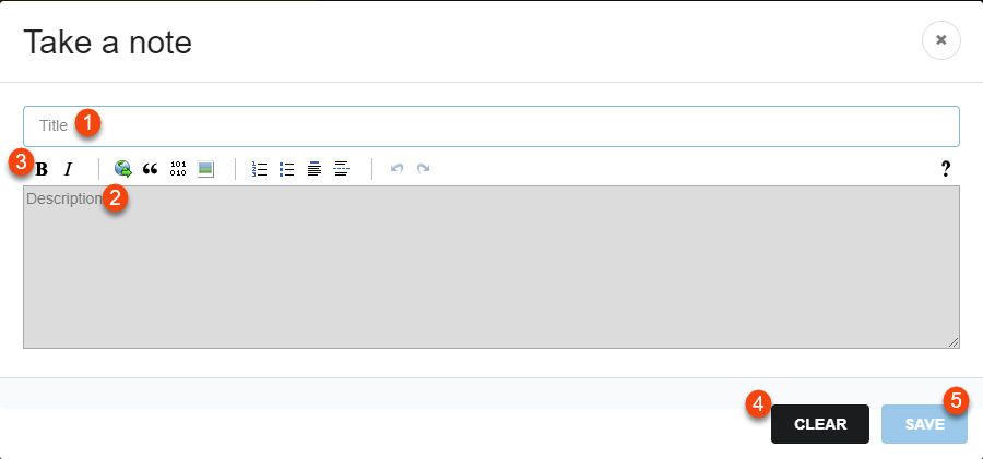 1. Enter an appropriate Title for your note, such that you can easily identify and retrieve the note 2. Enter Details of the note 3. The toolbar comprises of various text formatting options 4. Click Clear, to delete and rewrite your notes. On clicking clear, the title is also cleared 5. Click Save to save the changes | ![]() |