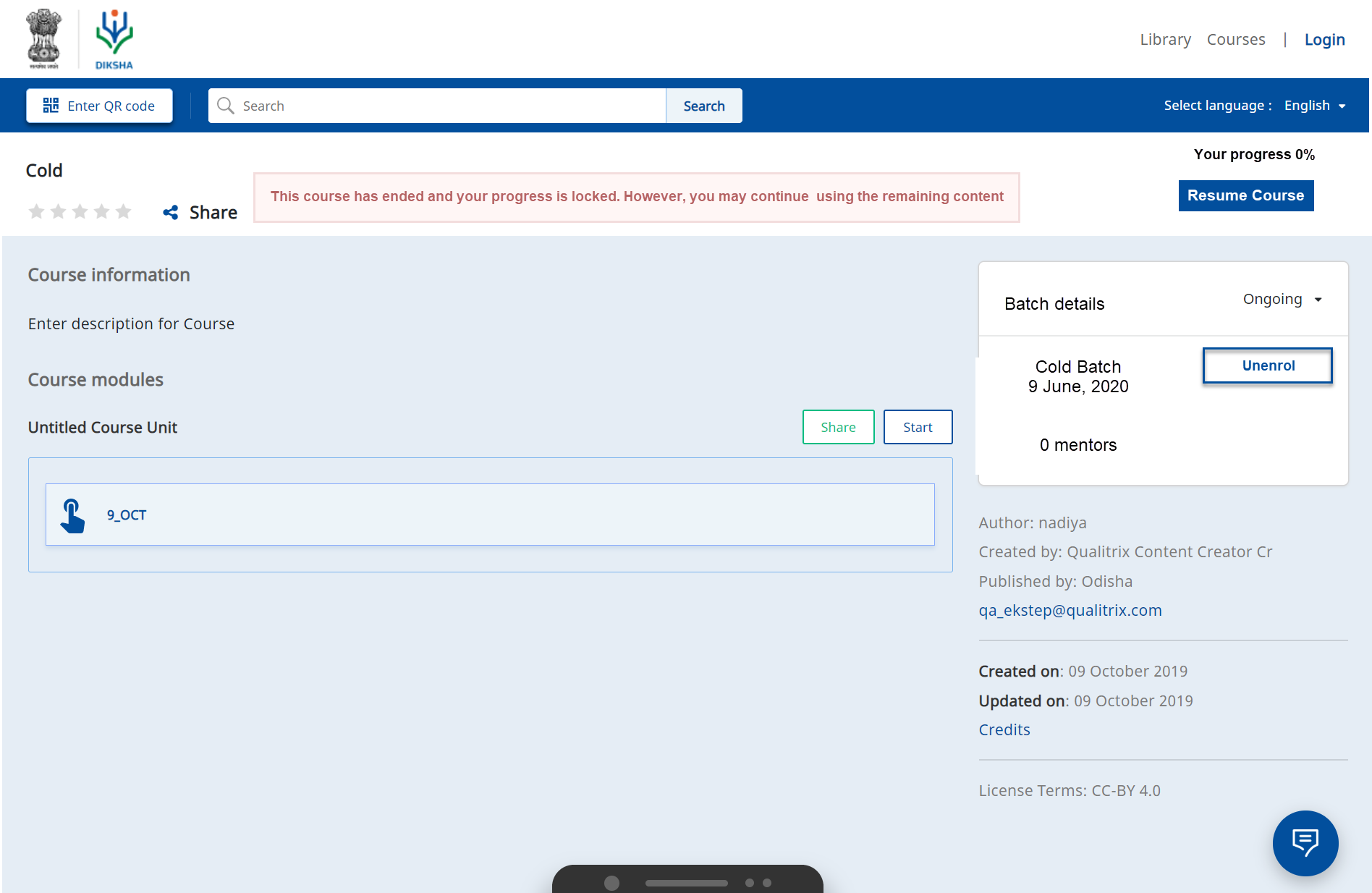 When you close your current course, deliberately or accidentally, even before you complete the course, you can resume and continue it. To resume the course, ensure that the course batch has not expired. You can open the course from the My Courses section.