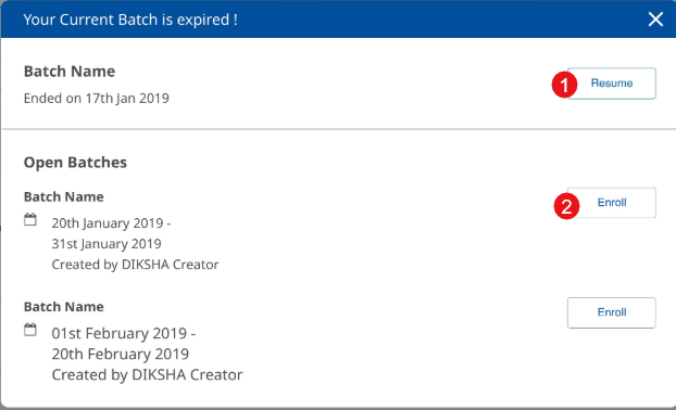Consider a scenario: you have joined in a batch and that batch has expired. To continue with the course, you must join another batch of the course. To find any upcoming or ongoing batch of the course, use the search and filter option on the Courses tab. 1. Click Resume to continue with the course in an expired batch. Note: The progress for this batch will not be captured 2. Click Enrol to register for an ongoing or upcoming batch Note: The cumulative progress is captured when you proceed with the batch | ![]() |
