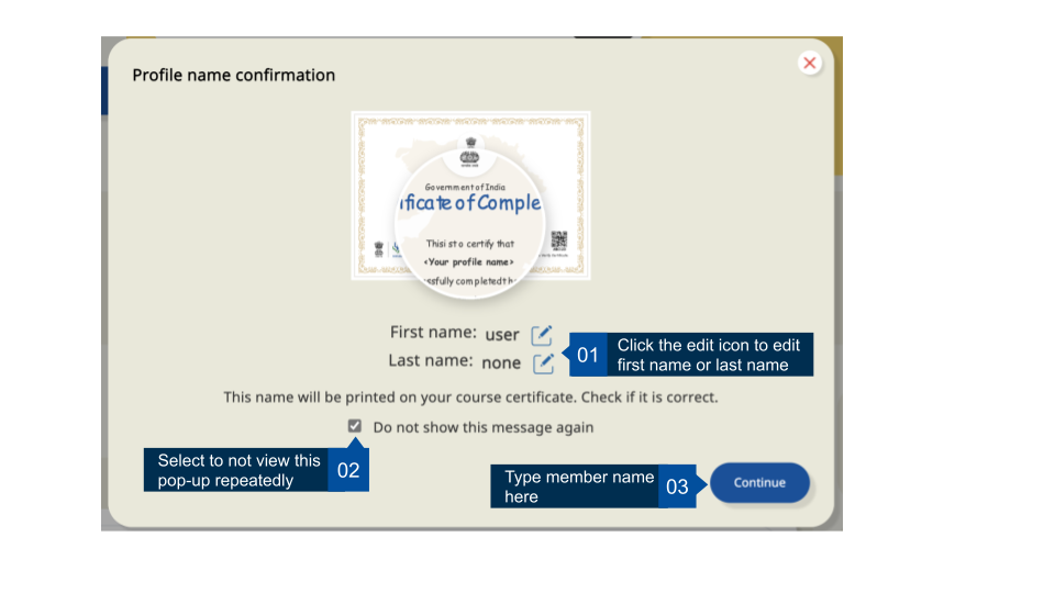 Click Join course, a pop-up is displayed. The name given in your profile is present on the certificate, you can make the required changes on this pop-up to edit your name | ![]() |