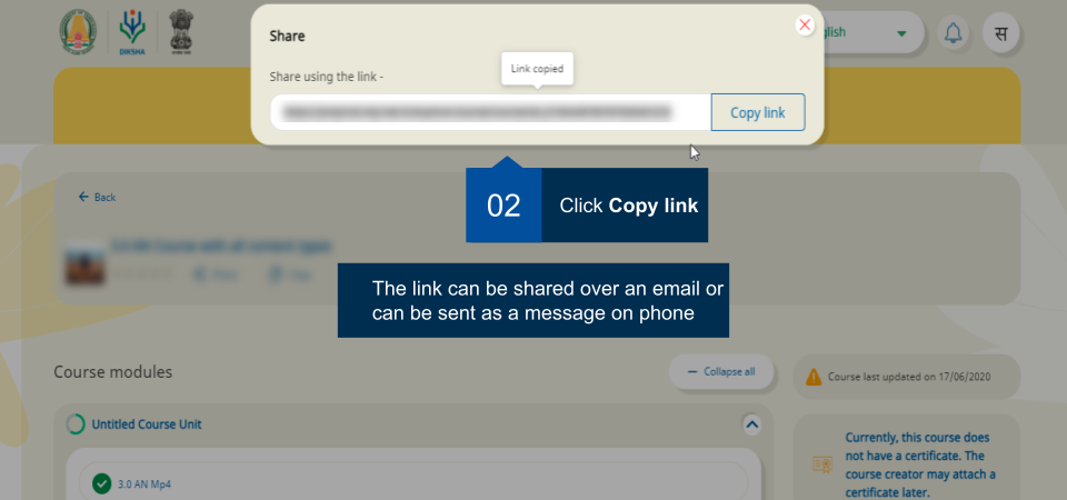 Click on the Share icon to share the link of the course. For more details, refer Sharing a course |