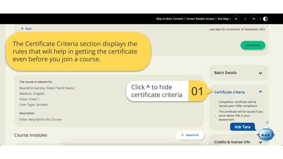 You can take up a course by enrolling for it. For details, refer Join course