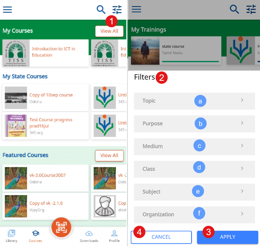 1. Tap the Filter icon on the Courses screen 2. Select one or more options from the following filter options: a. Topic For details refer Searching with Topics b. Purpose c. Medium d. Class e. Subject f. Organization 3. Tap APPLY to apply the filters 4. Tap CANCEL to exit the screen | ![]() |
