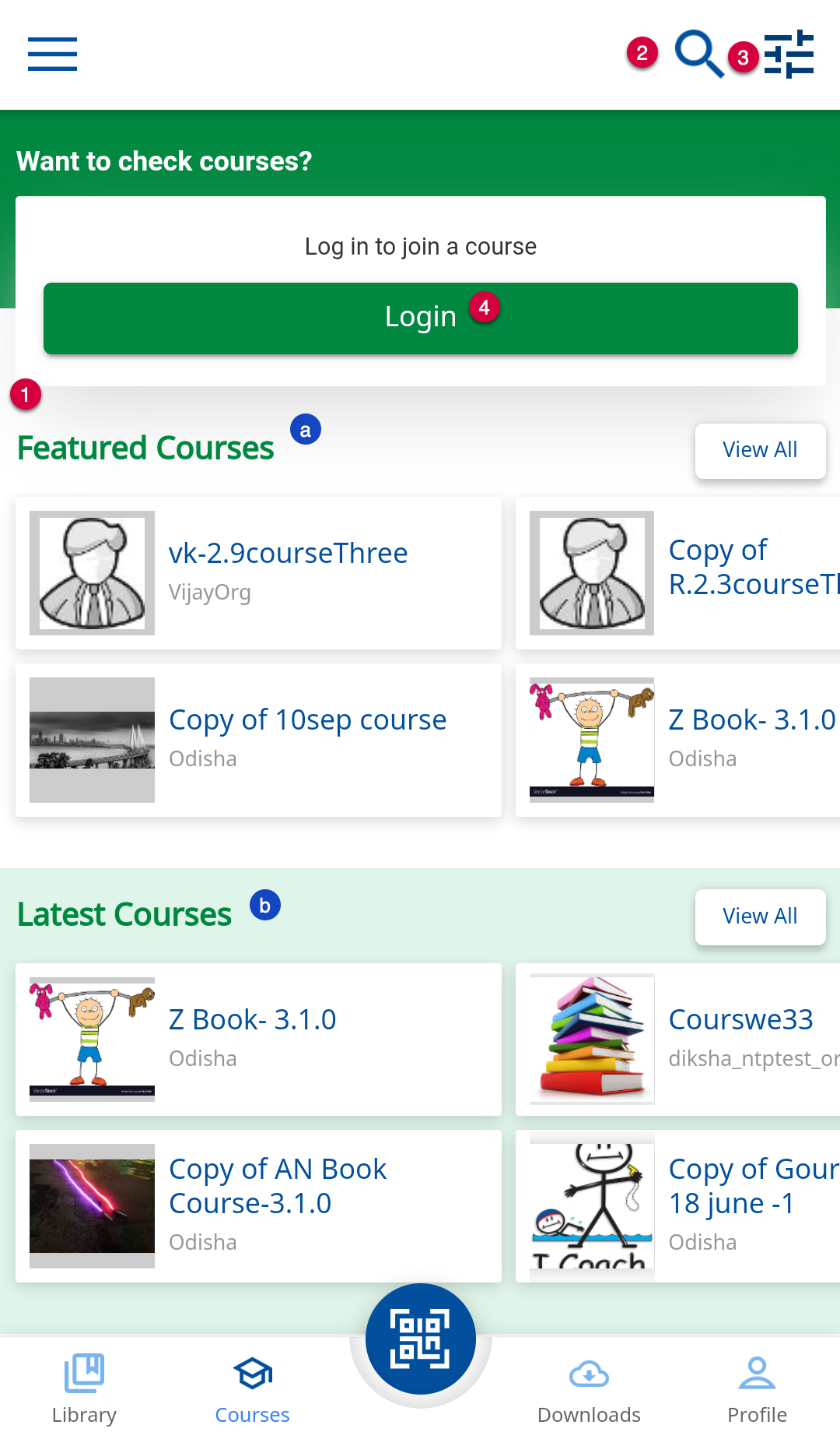 1. The available courses are categorized as: a. Featured Courses b. Latest Courses 2. Tap the Search icon and enter relevant keywords 3. Tap the Filter icon to apply filters on your library content. For details refer, Search Using Filters 4. Tap Login to login and join any course | ![]() |