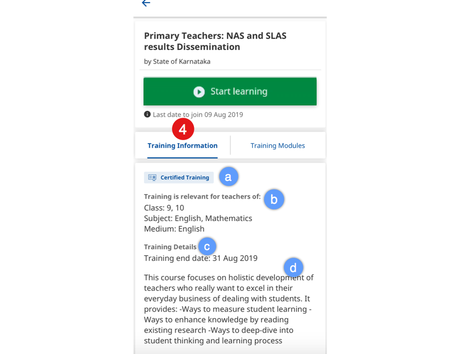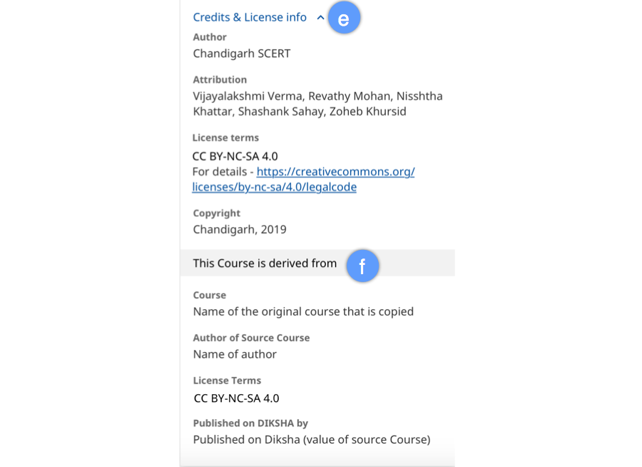 a. Certified Course. This information is present only for the courses that are certified b. Course is relevant for teachers of Class, Subject, and Medium c. Course details d. Course description | ![]() |