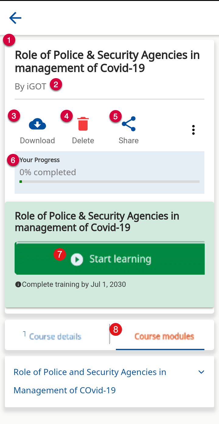 2. Name of the course creator 3. Click download icon to download the course 4. Click delete icon to delete this course from the list of courses 5. Click share icon to share this course with others 6. The progress bar tracks the user's progress in completing the course 7. Tap Start Learning to join in the course 8. Tap Course Modules to view the different modules in the course | ![]() |