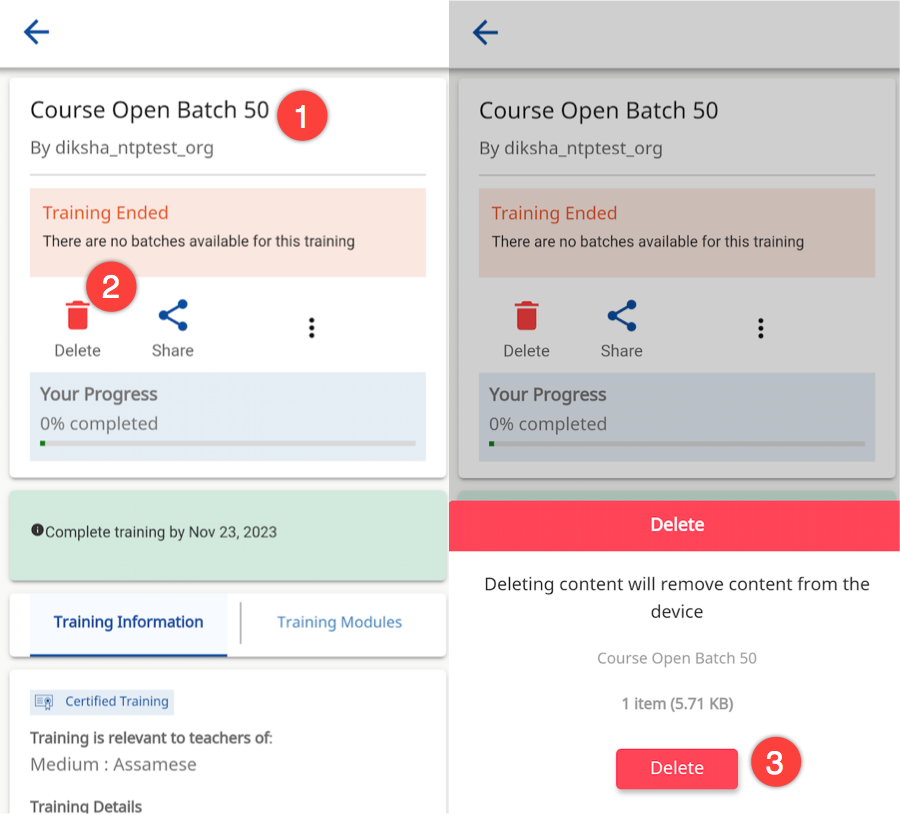 1. Tap the course card under My Courses section 2. Tap Delete icon. A Delete pop up is displayed 3. Tap Delete The content will be deleted from your device storage | ![]() |