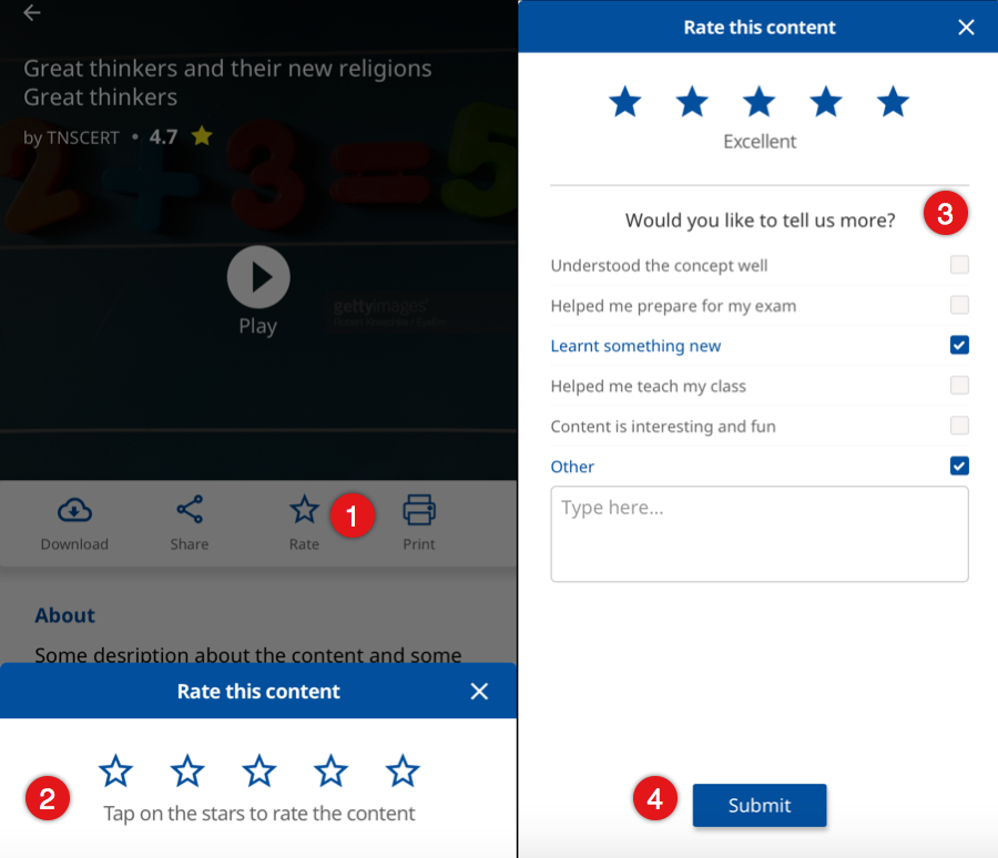 A Rate Content pop up appears where you can rate the course 2. Use the Star icons to rate 3. Provide your feedback in the Feedback field Adding comments as feedback is optional 4. Tap Submit to submit your rating and feedback Note: Rating option is not available for all kind of content apart from HTML content | ![]() |