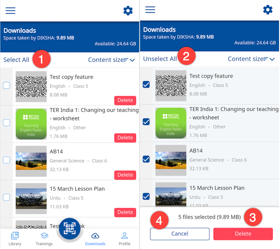 1. Tap Select All to select all the content. Or, select multiple content by selecting the check-box placed beside each content card. 2. The selected contents are highlighted 3. Tap Delete to remove all the selected contents from your mobile 4. Tap Cancel to go back to the previous page | ![]() |