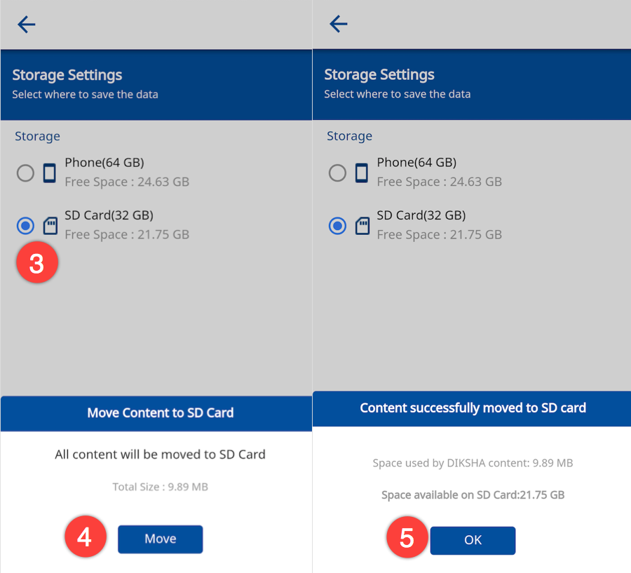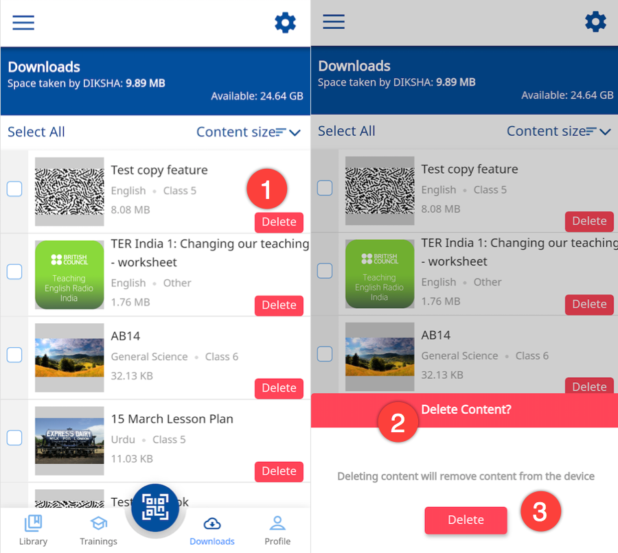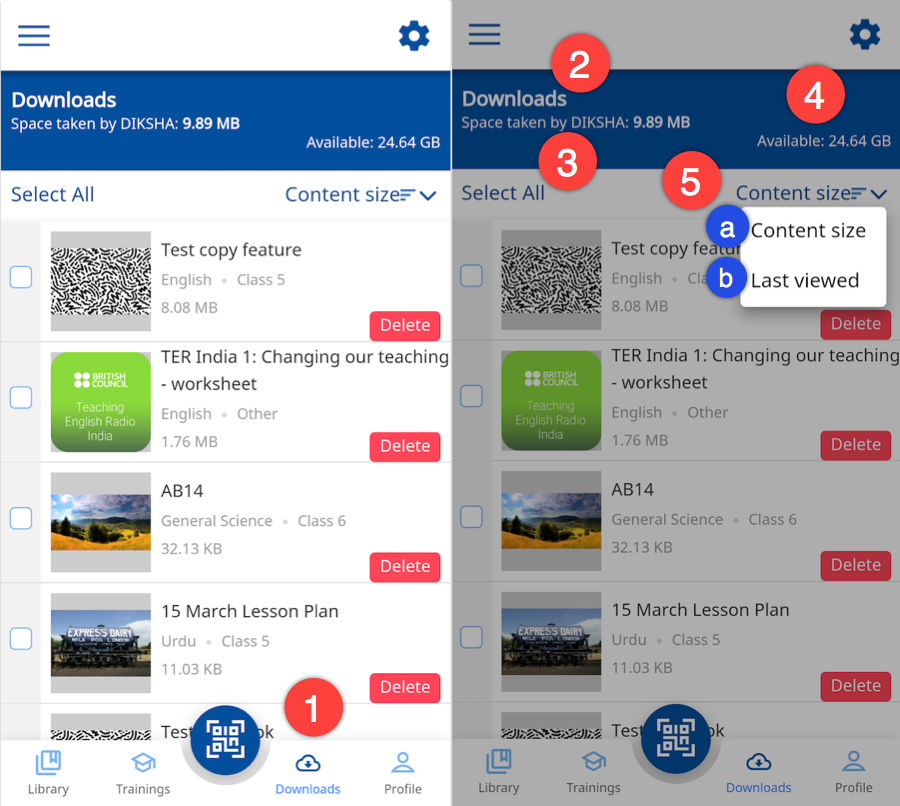 2. The downloaded content is displayed here 3. Displays the space utilized by DIKSHA app on your mobile device 4. Displays the empty space on your mobile device 5. Tap Content size button to sort the content by: a. Content size b. Last viewed Note: The content list by default is sorted based on content size. It displays the largest file first | ![]() |