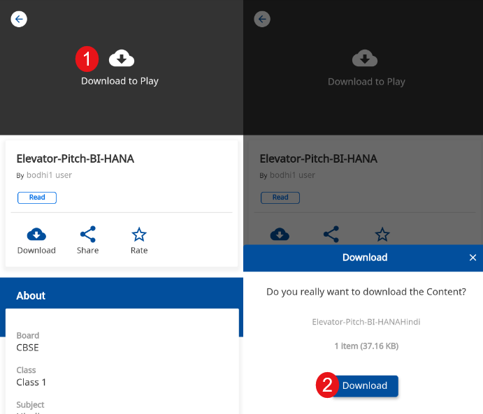 1. You can view the progress of the download 2. Tap Hide to prevent the download pop-up being seen 3. Tap CANCEL to stop downloading the content Note: The content is downloaded into your mobile storage | ![]() |