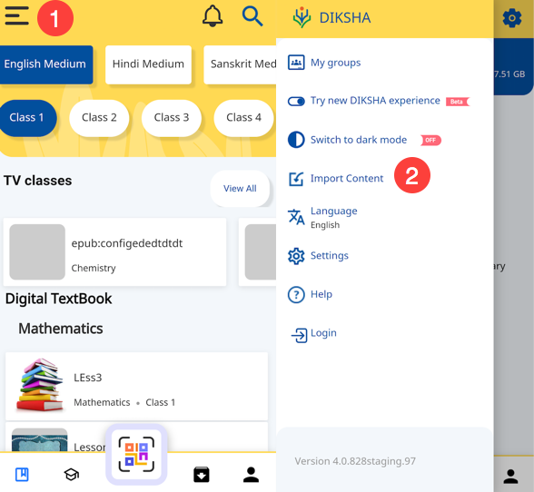 Import content in DIKSHA allows uesrs to import .ecar, .epar, and .gsa files from the mobile’s downloads folder into the app. The user can then play the content online.