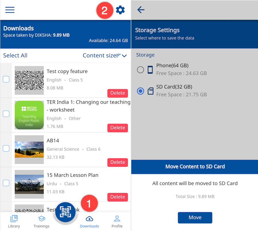Once you download content using the DIKSHA app, the downloaded content gets saved in your phone storage. You can see all the downloaded content by tapping the Download tab.