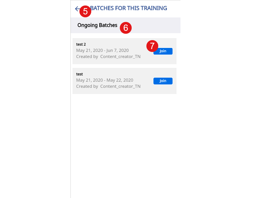 6. The following details of an upcoming or an ongoing batch is displayed a. Start and end date of the batch b. Batch creator c. Last date of enrolment in a batch 7. Tap Join to join the course Note1. You can join a course only when logged in as a registered user, else you have to log in and then join the course. 2. Before starting the chosen course, you must to agree to the terms and policies of DIKSHA. The ‘Continue’ button on the pop-up is enabled only after you check the box. You cannot exit the pop-up without agreeing. 3. On clicking Start Learning, a pop is displayed. The name diplayed here is what would be dispalyed on the certificate, you can edit the name on this pop-up to make any changes required Note: You can resume a course in an ongoing batch, i. provided the enrolment end date has not passed. ii. from the section conducted just before the batch expired. It captures the cumulative progress of the two courses. You cannot join an expired batch, and once a batch has expired, the course's progress will not get updated. | ![]() |