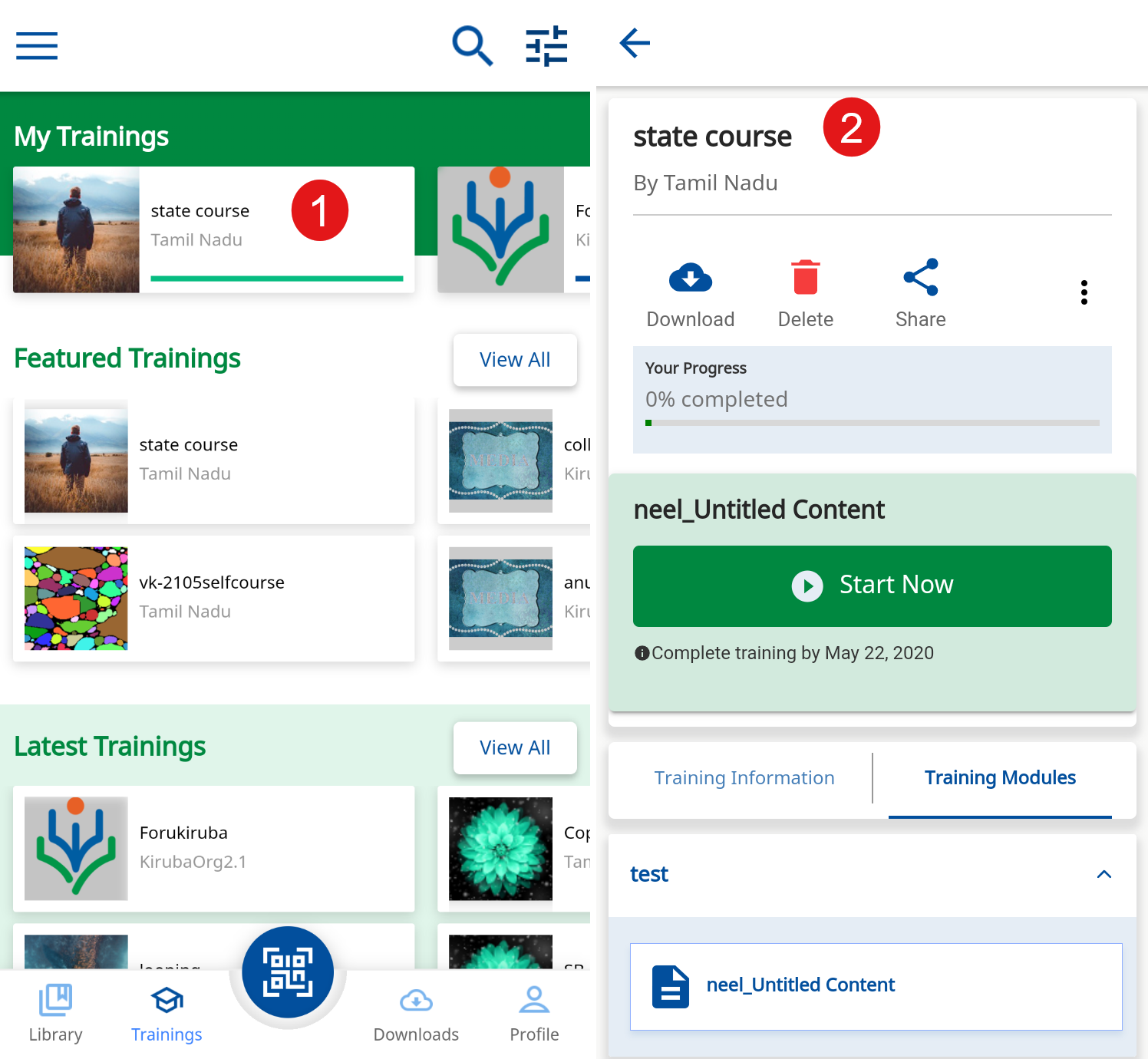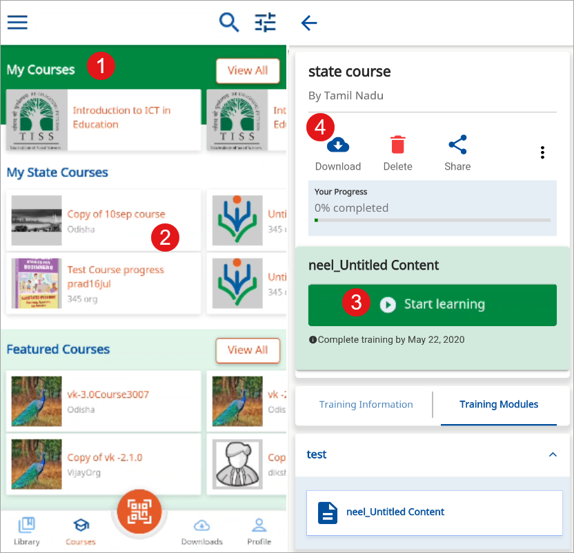 2. Tap the course to open 3. Tap Start Learning to start your course 4. Tap Download icon to download the course Note: You can view all downloaded content offline | ![]() |
