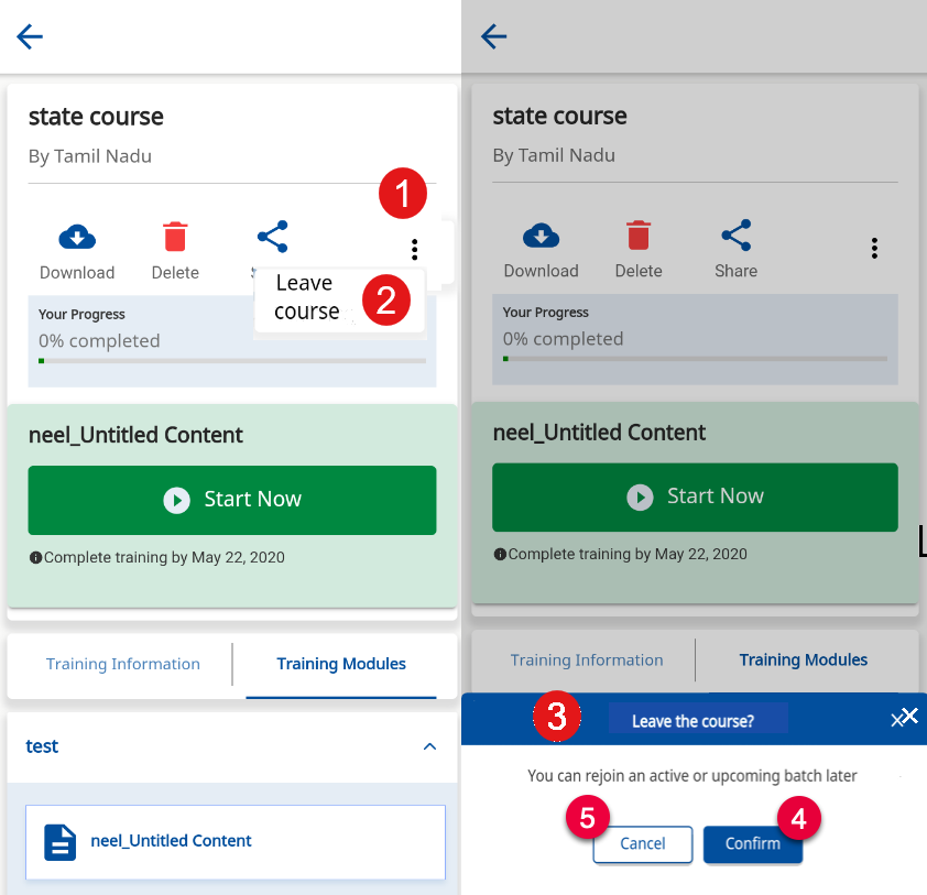 2. Tap Leave Course 3. The Leave course pop-up box is displayed 4. Tap Confirm to leave the course 5. Tap Cancel | ![]() |