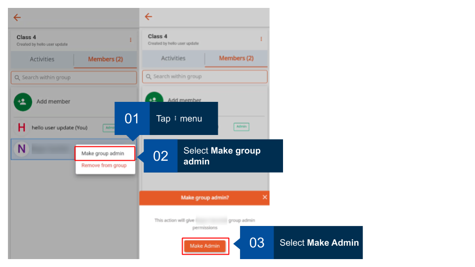 The default group administrator (the group creator) can promote group members as group admins thereby giving them additional rights and permissions.