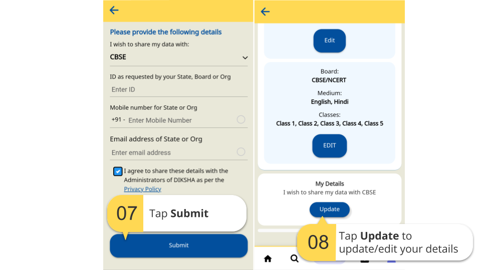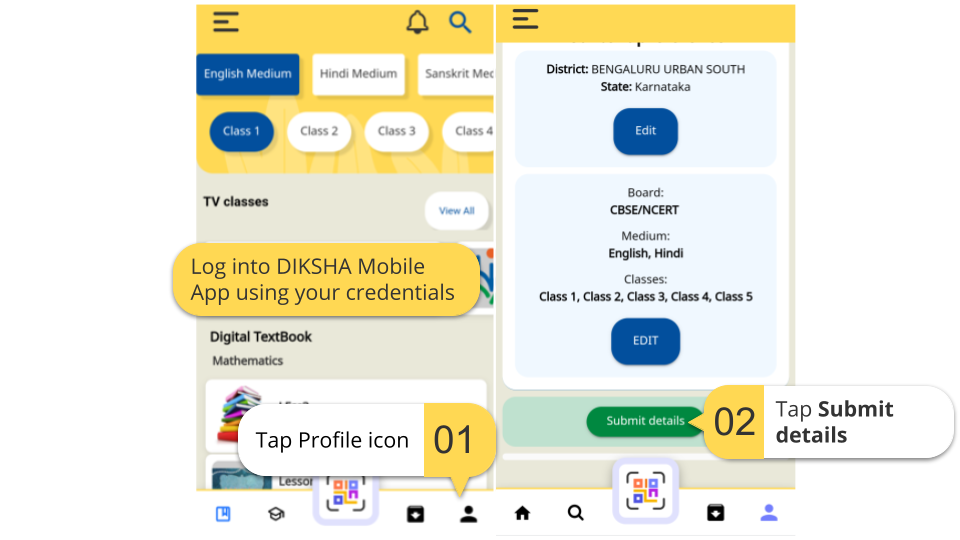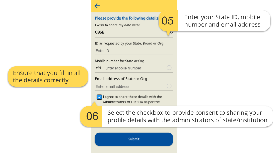 DIKSHA mandates its logged-in users to declare their details. Users can submit all necessary information through their profile on DIKSHA.