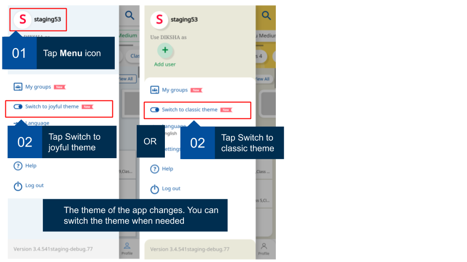 The help section within the DIKSHA mobile app assists users to change the look and feel of the application. You can switch the themes to the new joyful theme or the classic theme using this option. You can access the themes section from the main app menu.