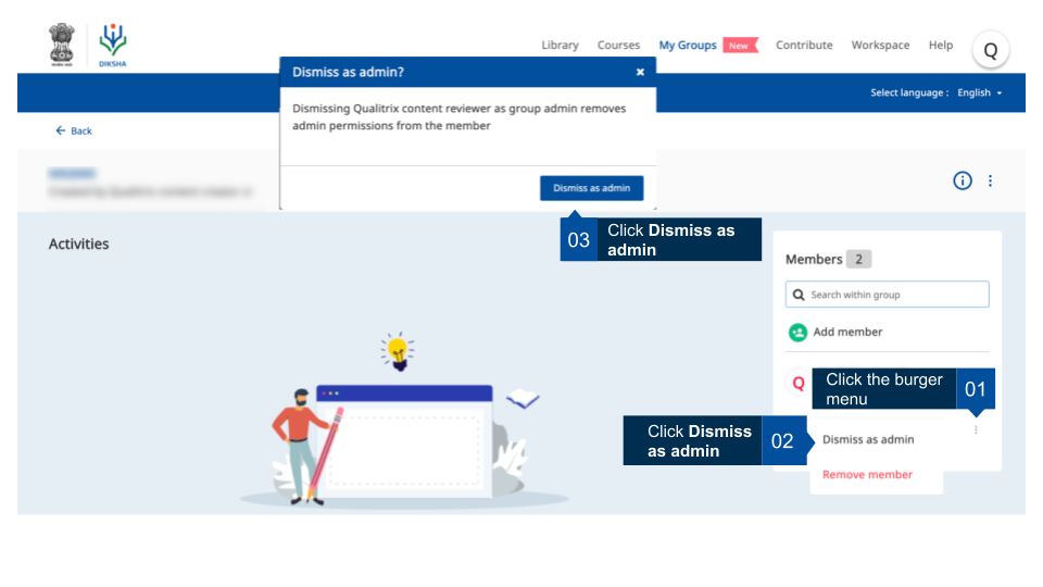 The registered user who creates a group is the default group administrator. Only the default group administrator can take away group admin status from other members who are designated group administrators. This page provides step-by-step instruction on how to remove a member’s the admin status.