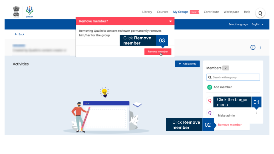 Group administrators can remove members from the group. This page provides step-by-step instruction on how to remove members from a group
