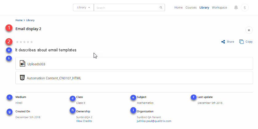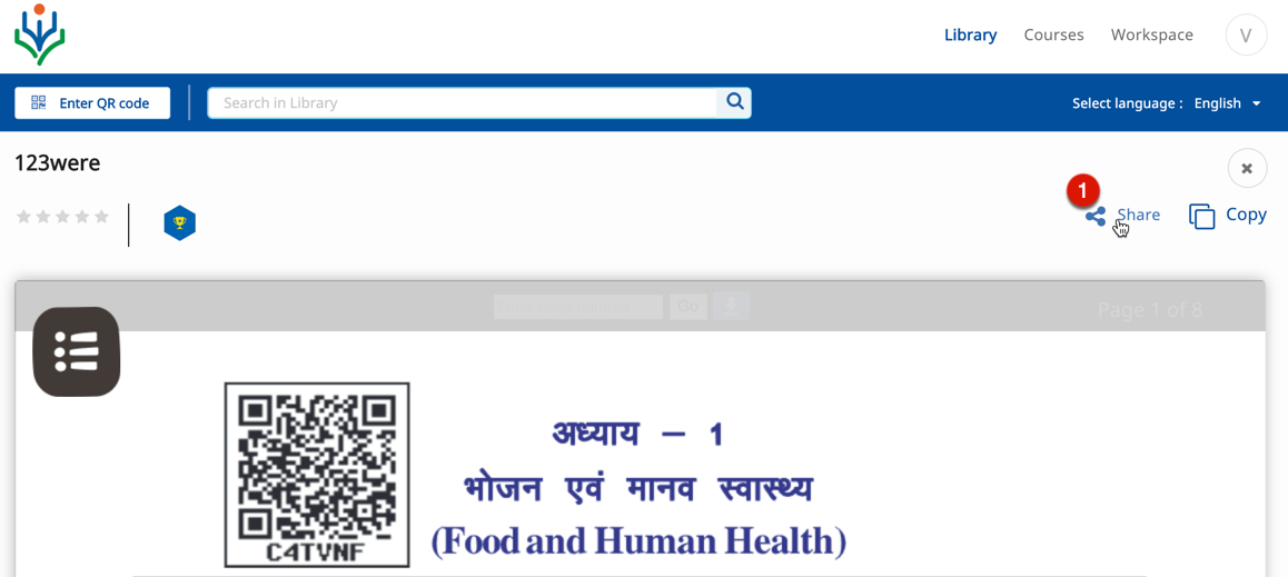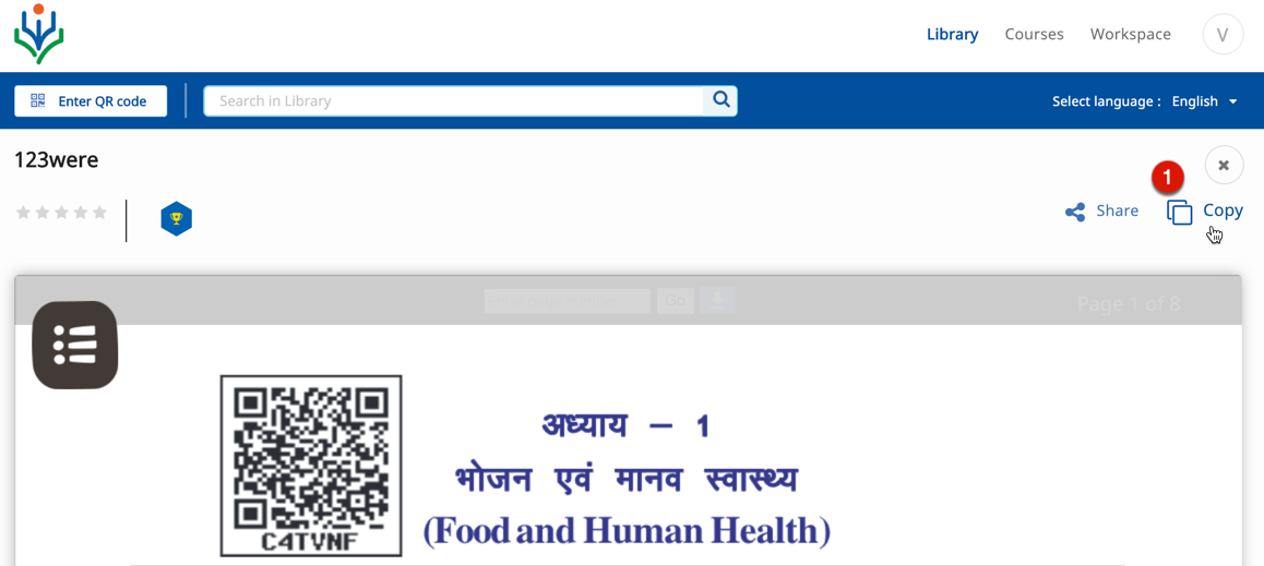 2. Description and details of the creator, organization, license etc are displayed below the content player. 3. Click the share icon to share this content 4. Click Copy to copy this content 5. The option Copy as course appears only if the content type is a textbook. Click this option to copy the textbook as a course | ![]() |