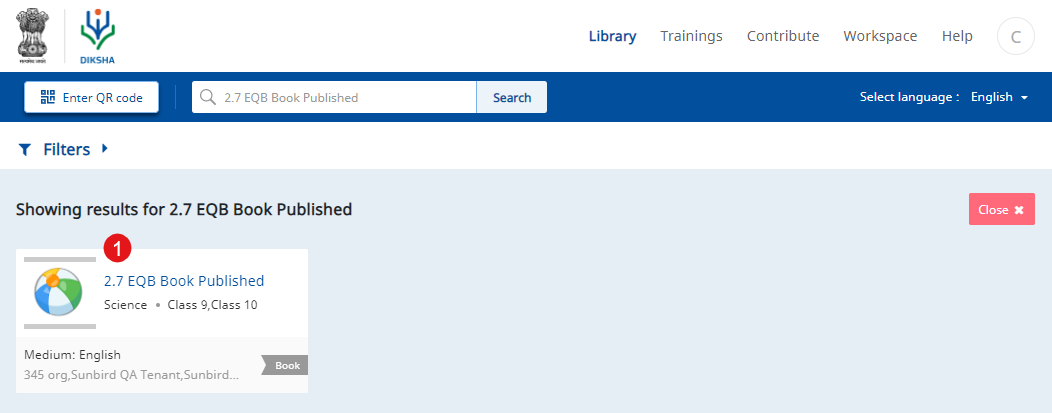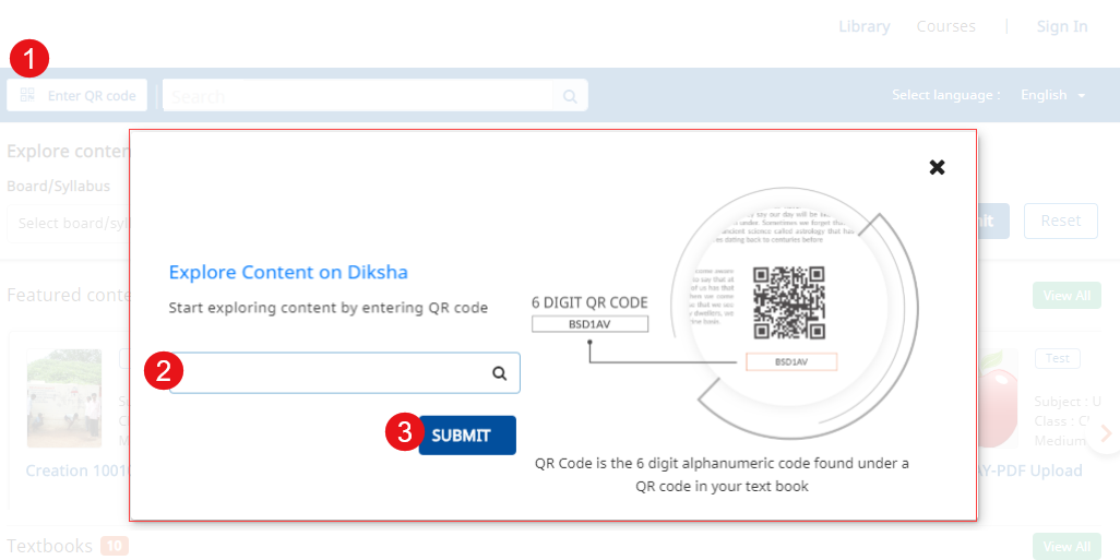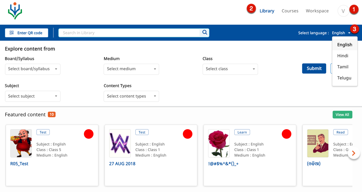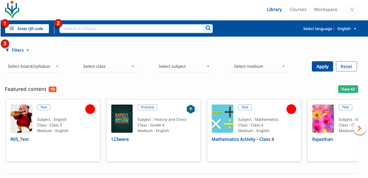 You can explore content in the Library section using either of the following options: 1. QR Codes 2. Search bar 3.Filters as follows: A. Board/Syllabus - You can filter content by known publishers like NCERT and, State or Central school boards B. Class - You can filter content based on the class in which you study C. Subject - You can filter based on the subject for which you need content D. Medium | ![]() |
