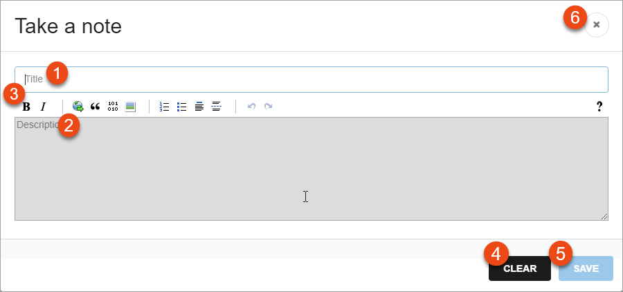 2. Enter Description 3. Use various formatting options to format the description 4. Click Clear to clear the note 5. Click Save to save the note 6. Click Close icon to exit the page | ![]() |